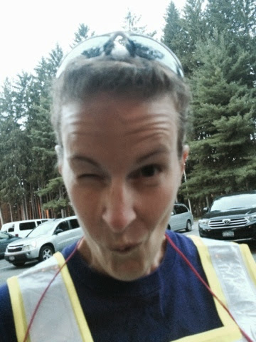 We brought my vehicle as one of the two team "vans." I left my house at 1:30am Friday morning and picked up KatieT, Alexis, Kristine, Tom, KatieM and KatieM. On the way down we saw a moose in the middle of the road acting all drunk and crazy; I believe we were down near Long Lake at that point. There were more people out driving then I expected during the night! Once we got on 87 south we passed two other vans on their way to Ragnar all decorated and realized we should have decorated our vehicle too! (Next time for sure!) We got to the start and used the porta potties, got our bibs and shirts and got all ready for Alexis to start us off. She started at 7:15am and kept a good pace. While she ran we drove to a Dunkin Donuts where they were less than friendly. KatieN asked what kind of bagels they have and was told "their on the second shelf" or something like that, indicating she could bloody well look for herself. hahahahahaha that woman hated her job!! We then drove the van to the 1st exchange and got the next runner ready to go and then waited for Kristine to start her first leg. Right before our 5th runner started we met up with the other van quickly to drop off some of their gear and Tom (he was riding with them and participating from their vehicle as one of the 2nd set of 6 on our team). When KatieT finished this leg she told us that she had stepped on a pair of poopy running spanx *blech* someone must have crapped themselves and wiggled out of them and left them... ugh. I was runner 6 and I ran the last leg for our van. My leg was partly on a pretty rough trail, which I wasn't expecting, and through Saratoga and some residental areas (aboutu 5.5 miles). At the first van exchange (when I finished, the last person in our van) we got something to eat (I had a pulled pork sandwich and a soda, I went omnivore for the weekend, back to veggie now). Some of the women noticed that Boniband (sp?) had left free headbands on people's van mirrors and so we went and stole lots of them hahahaha! Then we drove up to the beach where we got to take a few hours off and shower, nap, and just relax. I took a shower but forgot a towel and so had to use my sweatpants to dry off!! At this point we also let another team tag and decorate our vechile and in turn they let us use their markers to add some of our own things to our vehicle like the names of the people in our van and boxes to check off after each leg.
